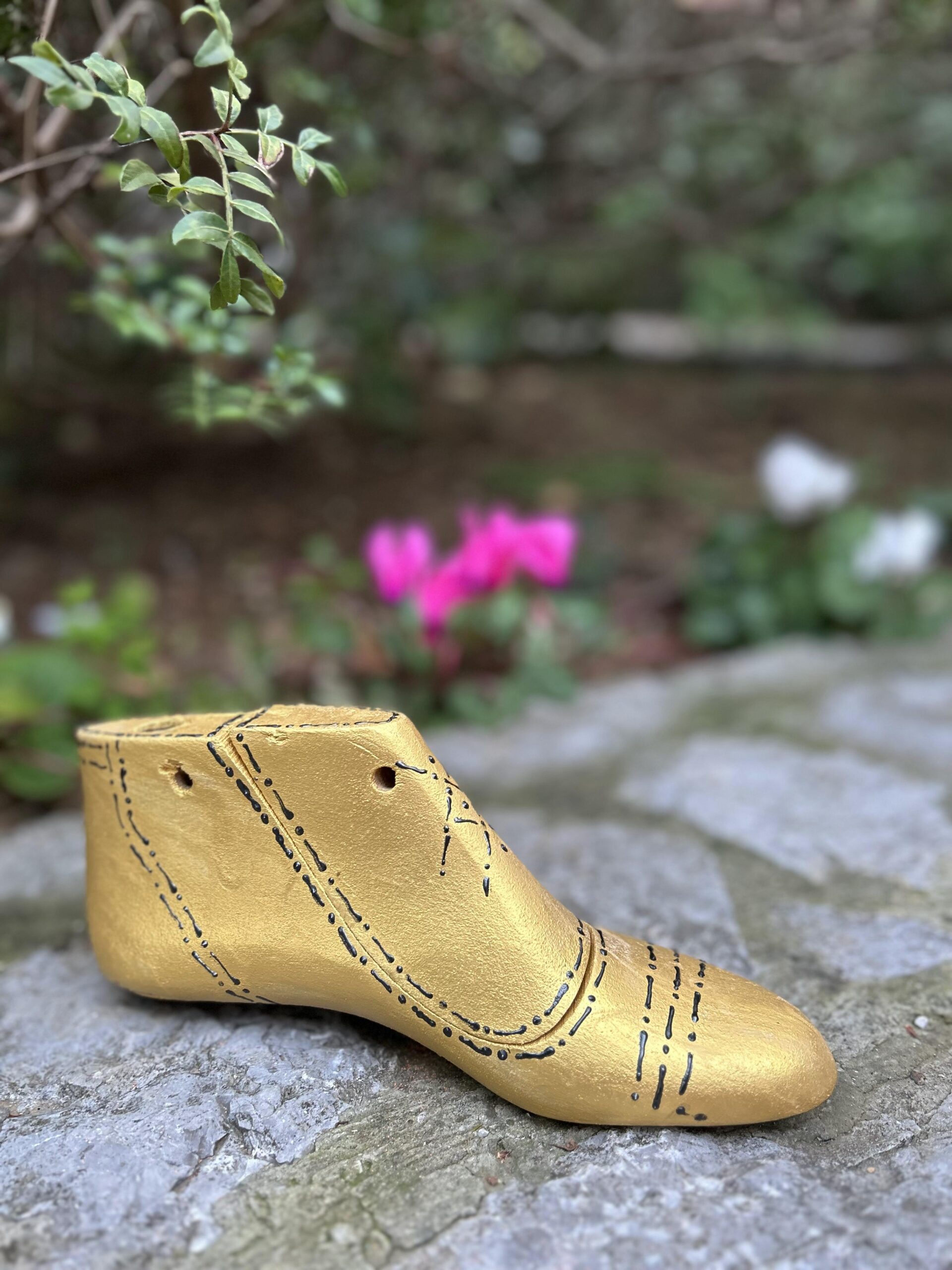 Διακοσμητικό ξύλινο καλαπόδι σε σχήμα μποτάκι “Golden Boots” , βαμμένο με χρυσό ακρυλικό χρώμα και διακοσμημένα με μαύρα γαζιά .