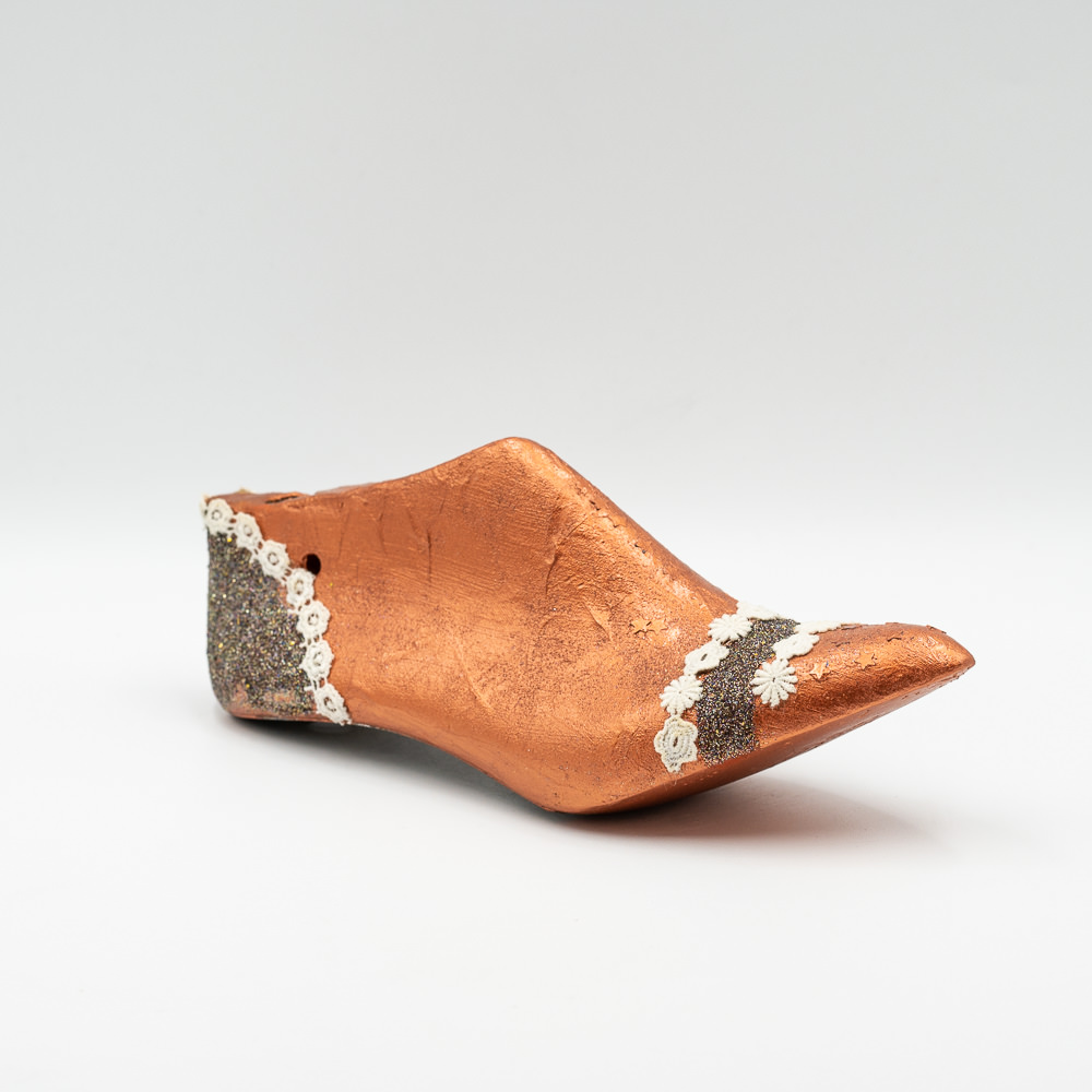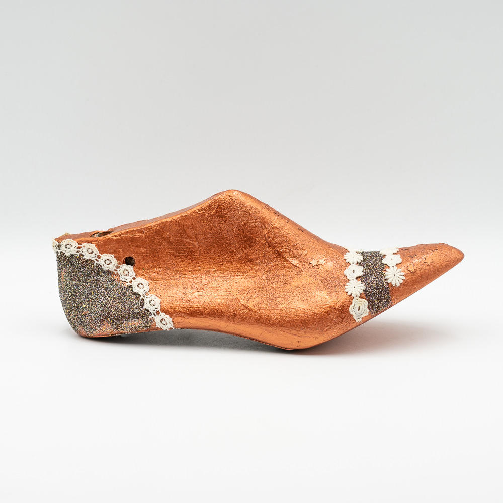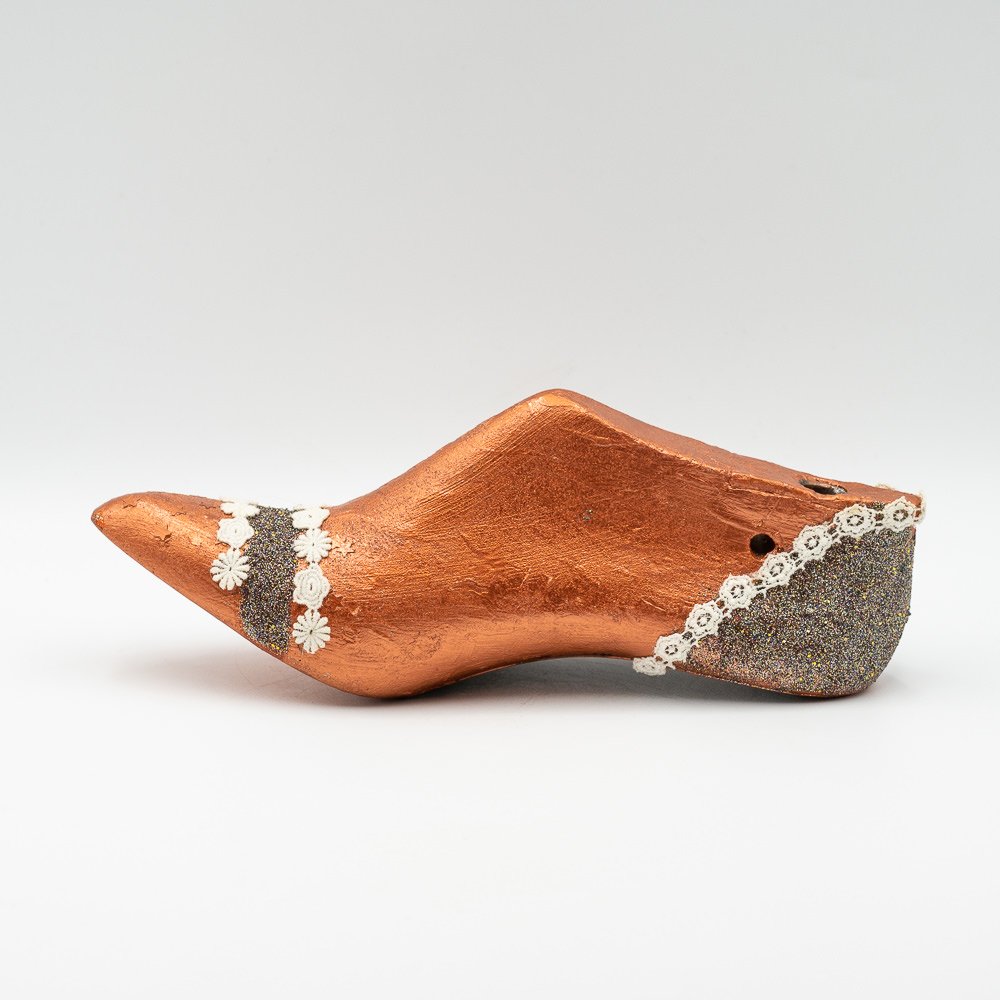 Ξύλινο διακοσμητικό βαμμένο με ακρυλικό μπρονζέ χρώμα με λεπτομέρεια από δαντέλα και άμμο.