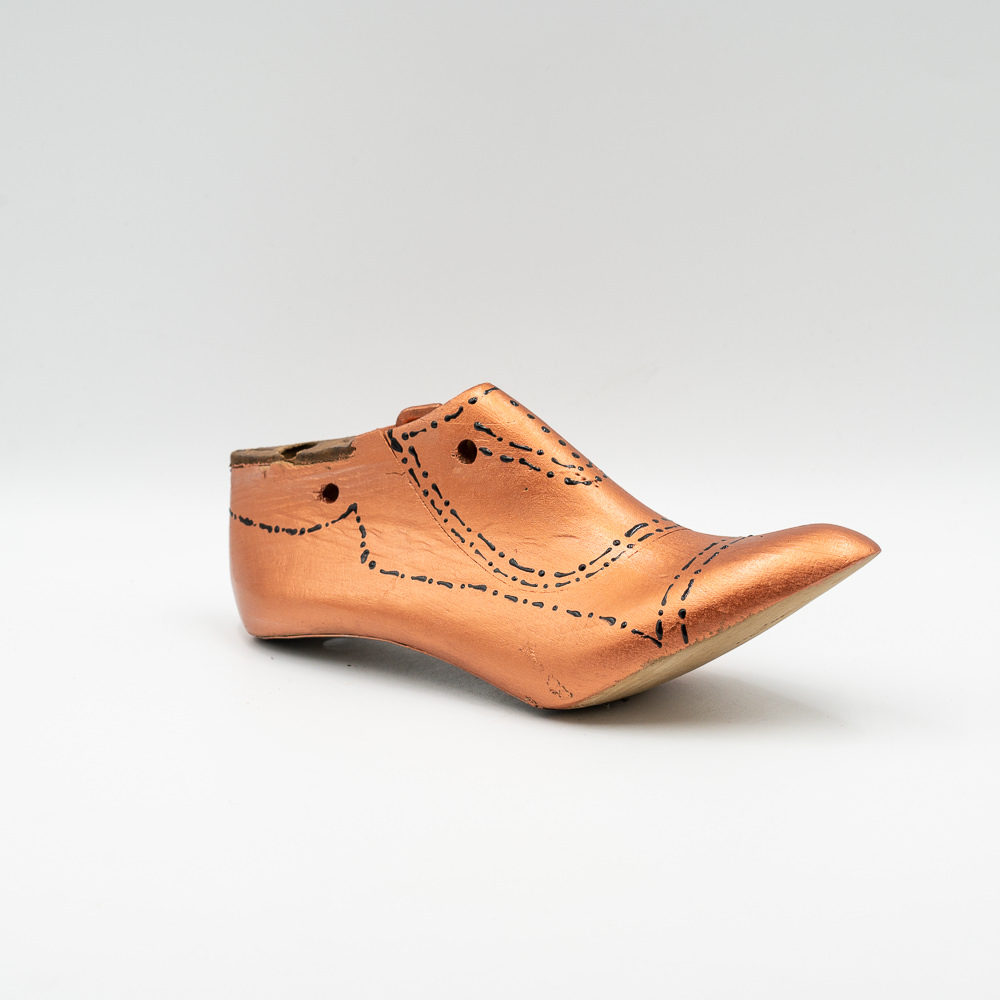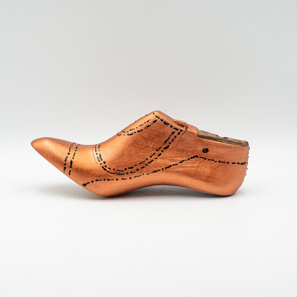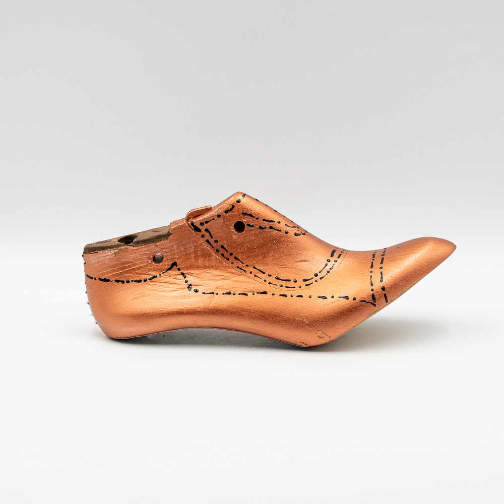 Ξύλινο διακοσμητικό , μπρονζέ με ακρυλικό χρώμα και διακριτικά μαύρα γαζία. Θυμίζει γοβάκι βγαλμένο από την Ανατολή.