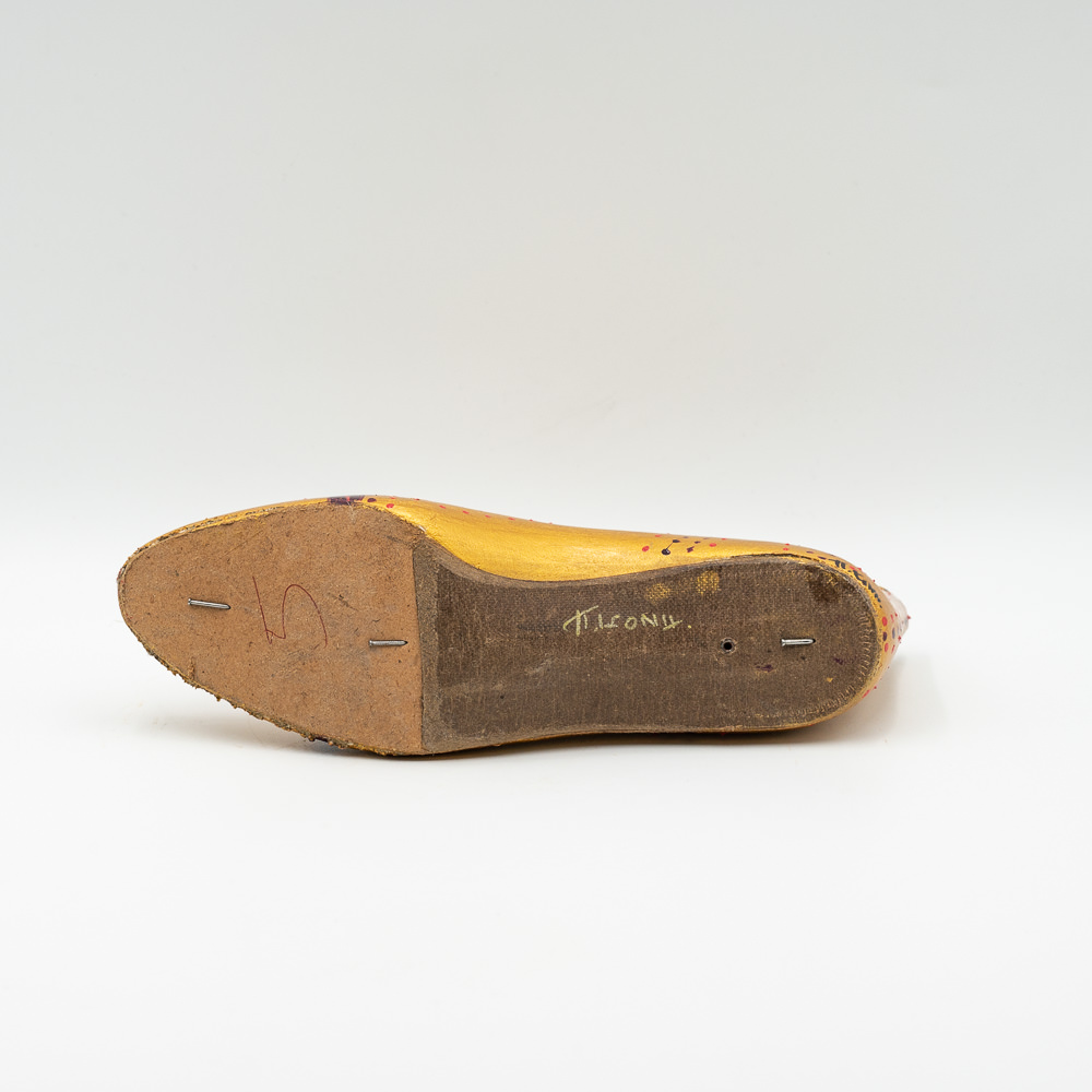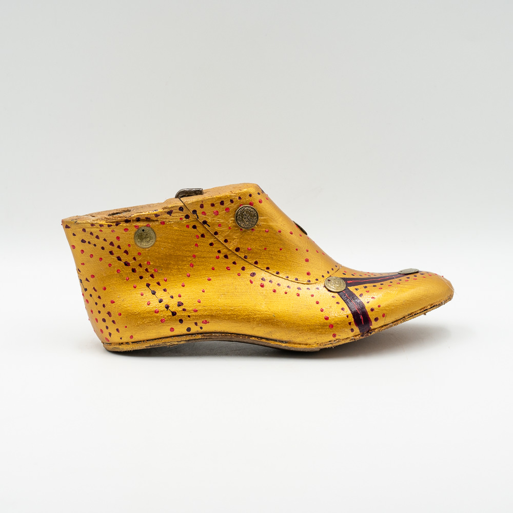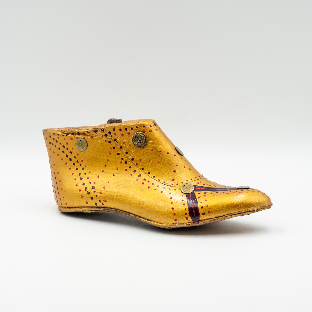 Ξύλινο μποτάκι βαμμένο με χρυσό ακρυλικό χρώμα και γαζιά μπρονζέ στολισμένο με χρυσά φλουριά.