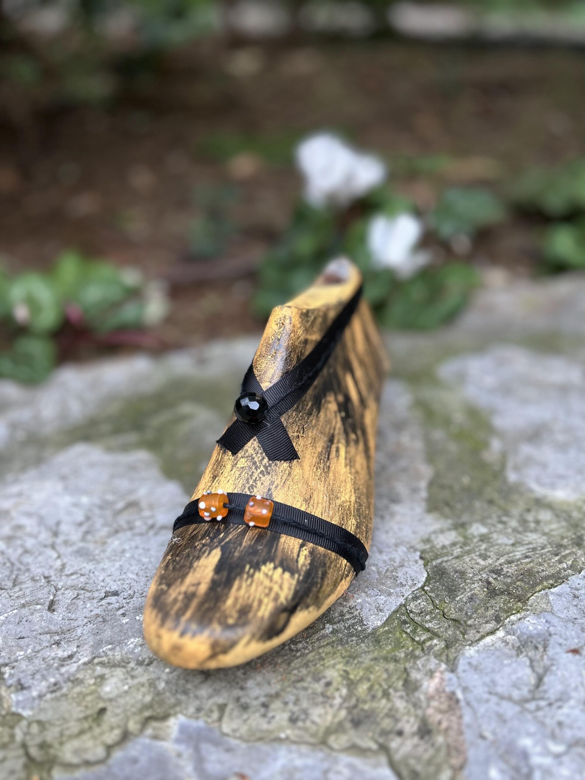 Διακοσμητικό ξύλινο καλαπόδι ‘Yellow Black’, βαμμένο με ακρυλικό κίτρινο χρώμα και μαύρες σκιές. Σατέν διακοσμητική κορδέλα-φιόγκο και με μαύρες και πορτοκαλί χάντρες.