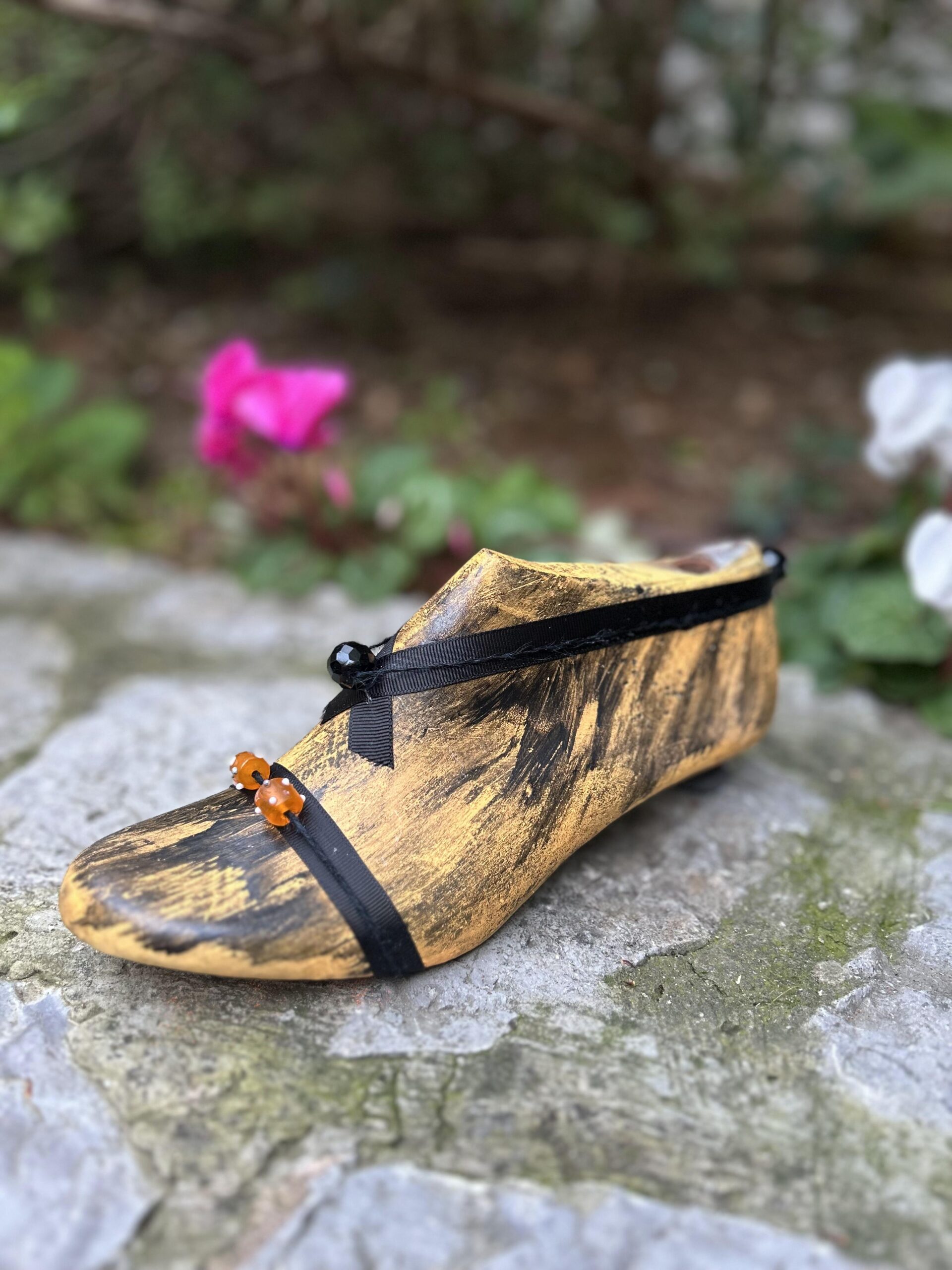 Καλαπόδι με κίτρινο χρώμα και μαύρες σκιές. Σατέν κορδέλα και με μαύρες και πορτοκαλί χάντρες.