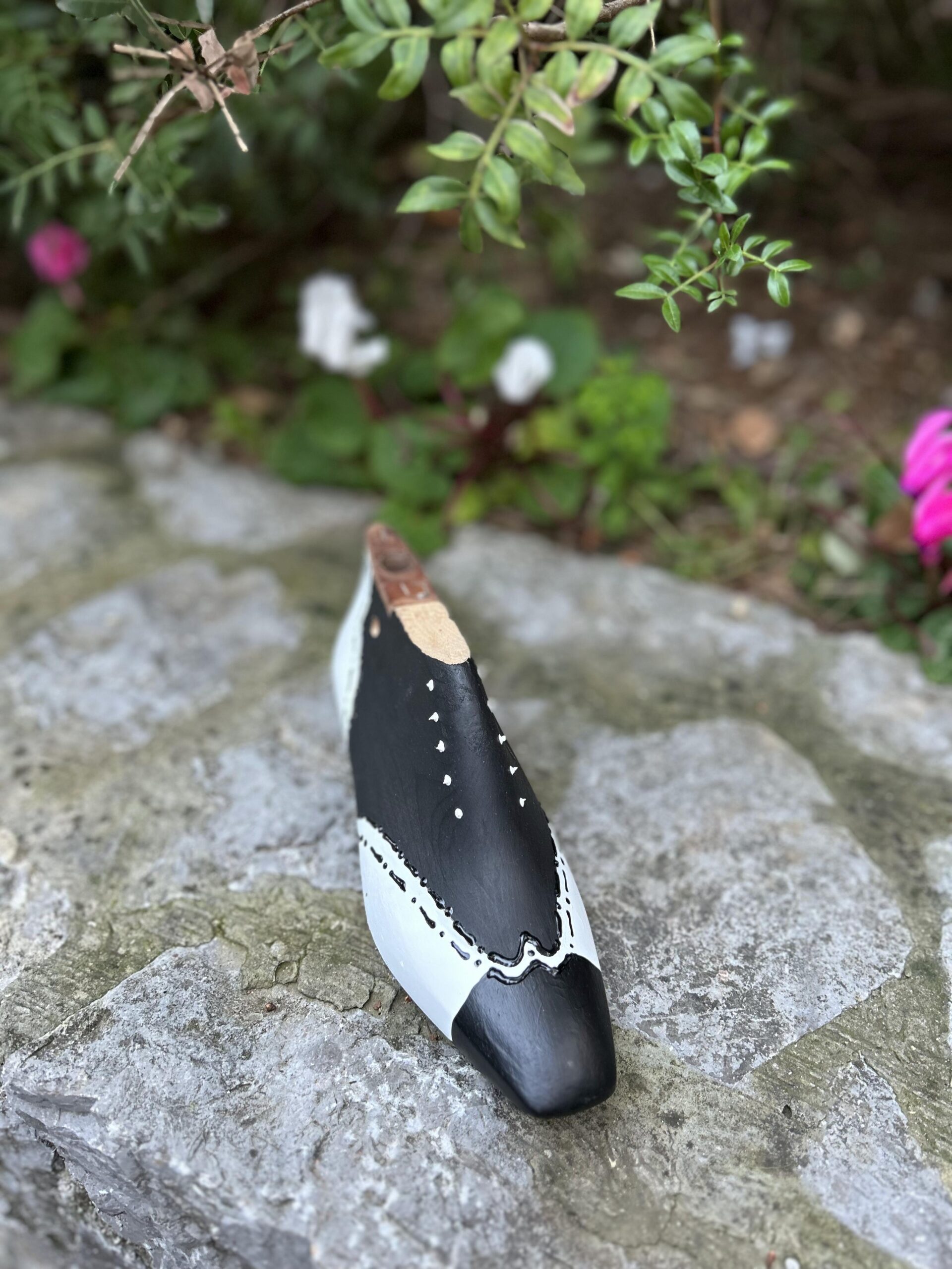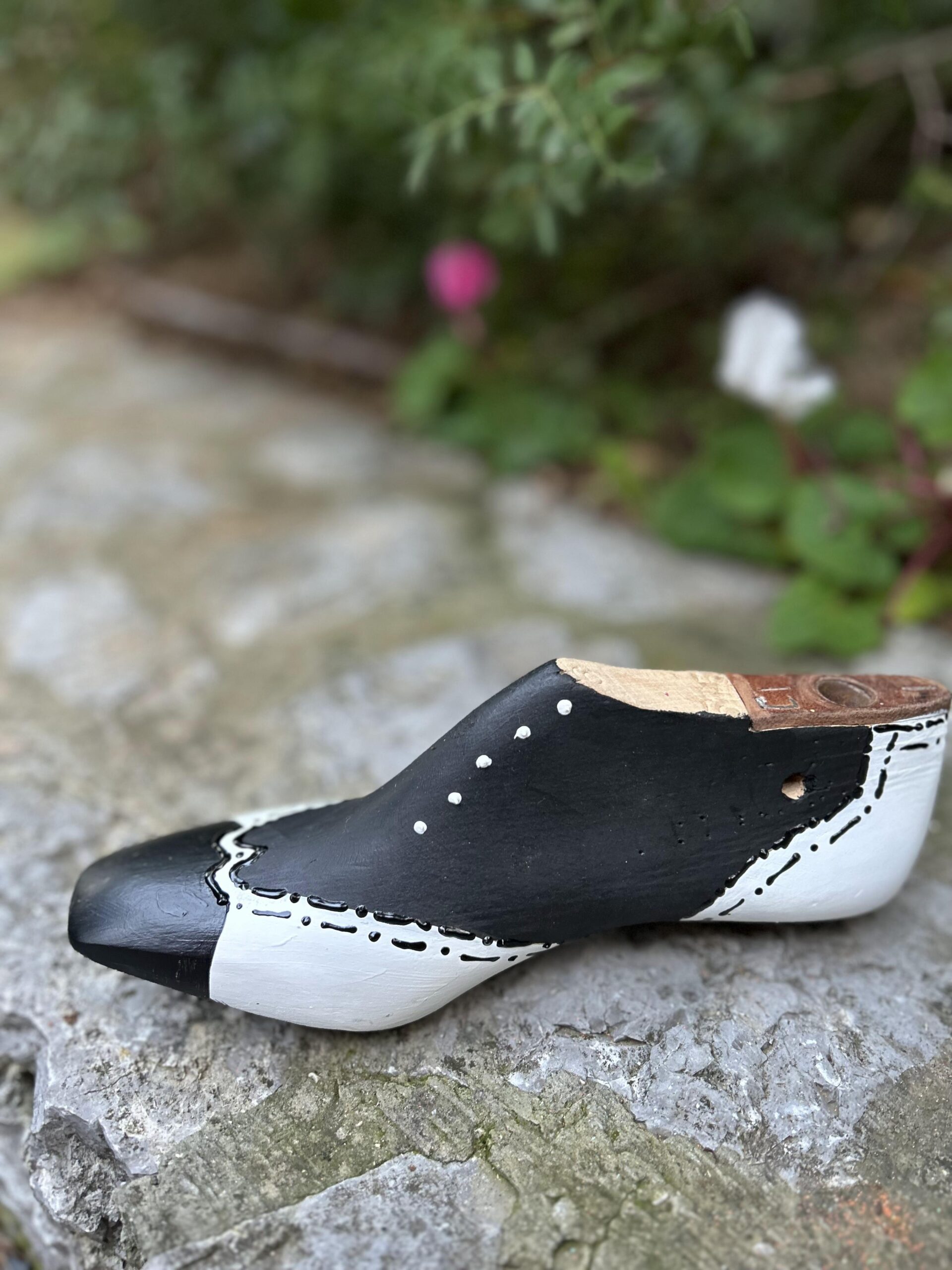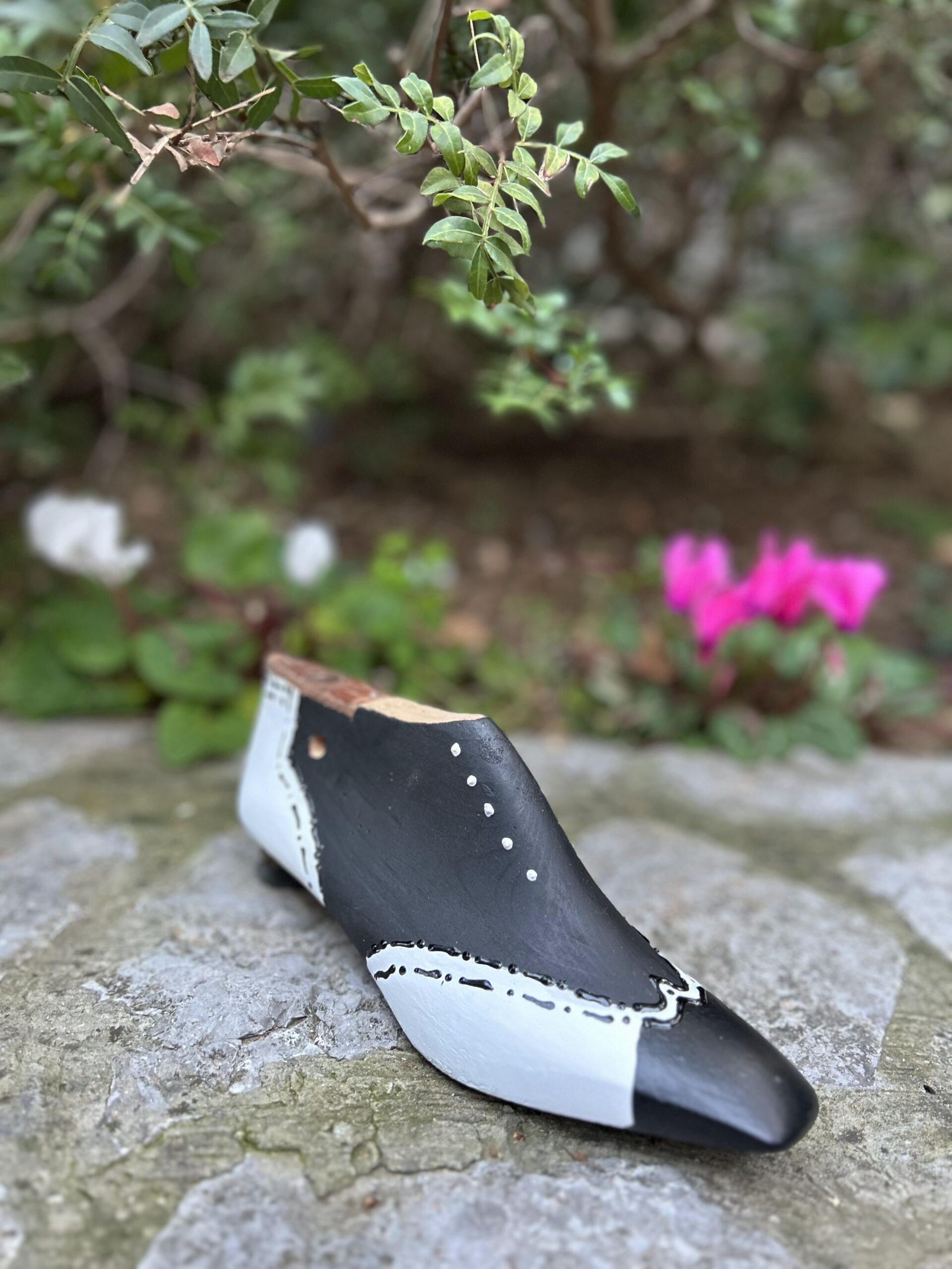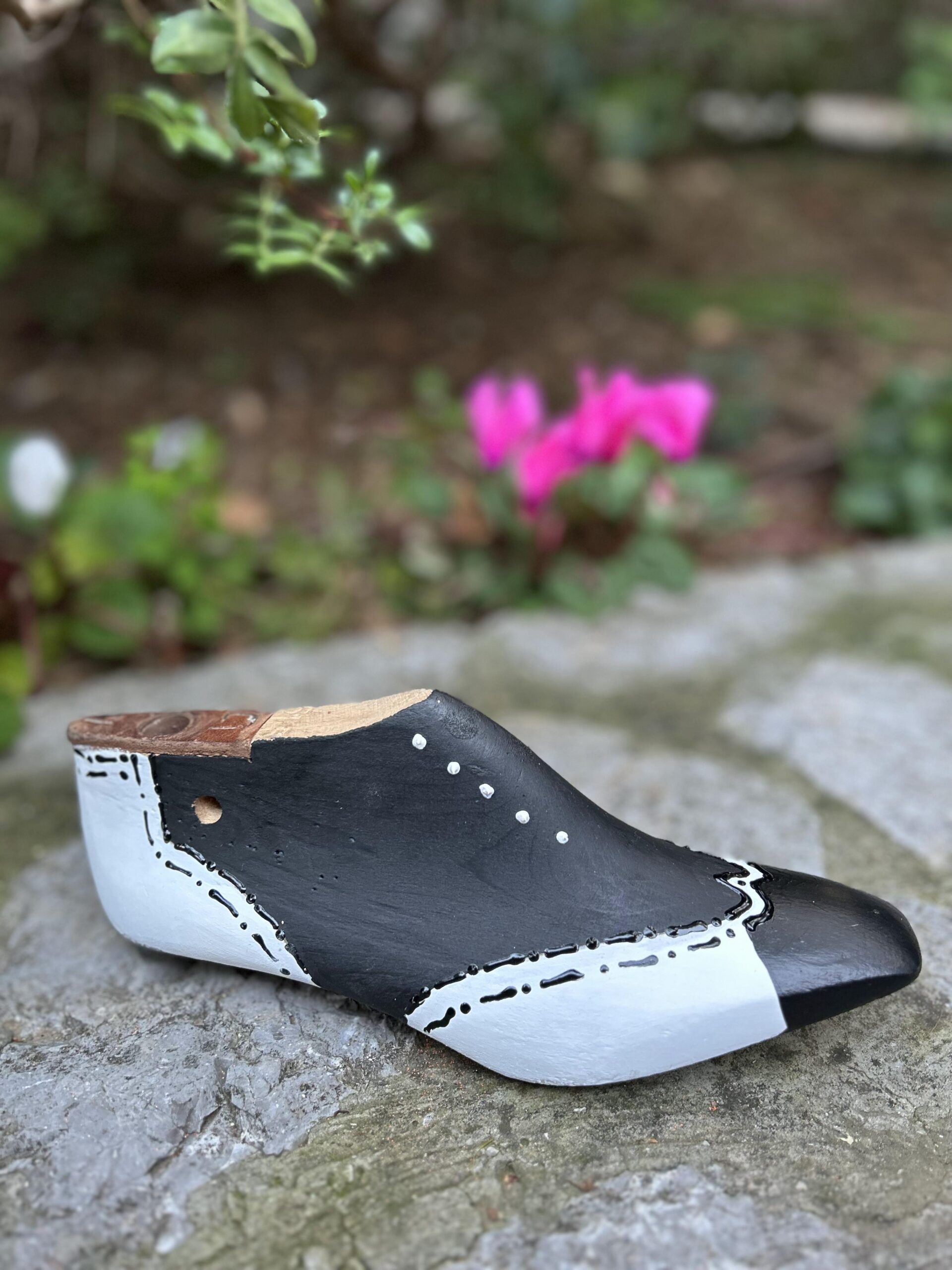 Διακοσμητικά ξύλινα καλαπόδια , με λευκό και μαύρο χρώμα. Λευκά και μαύρα γαζιά και χρυσά μοκασίνια .