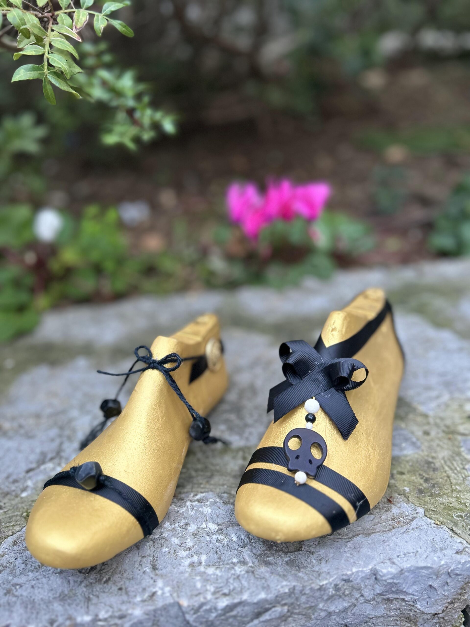 Διακοσμητικά καλαπόδια, με ακρυλικό χρυσό χρώμα , γκοφρέ μαύρο φιόγκο και μαύρες πέτρες .