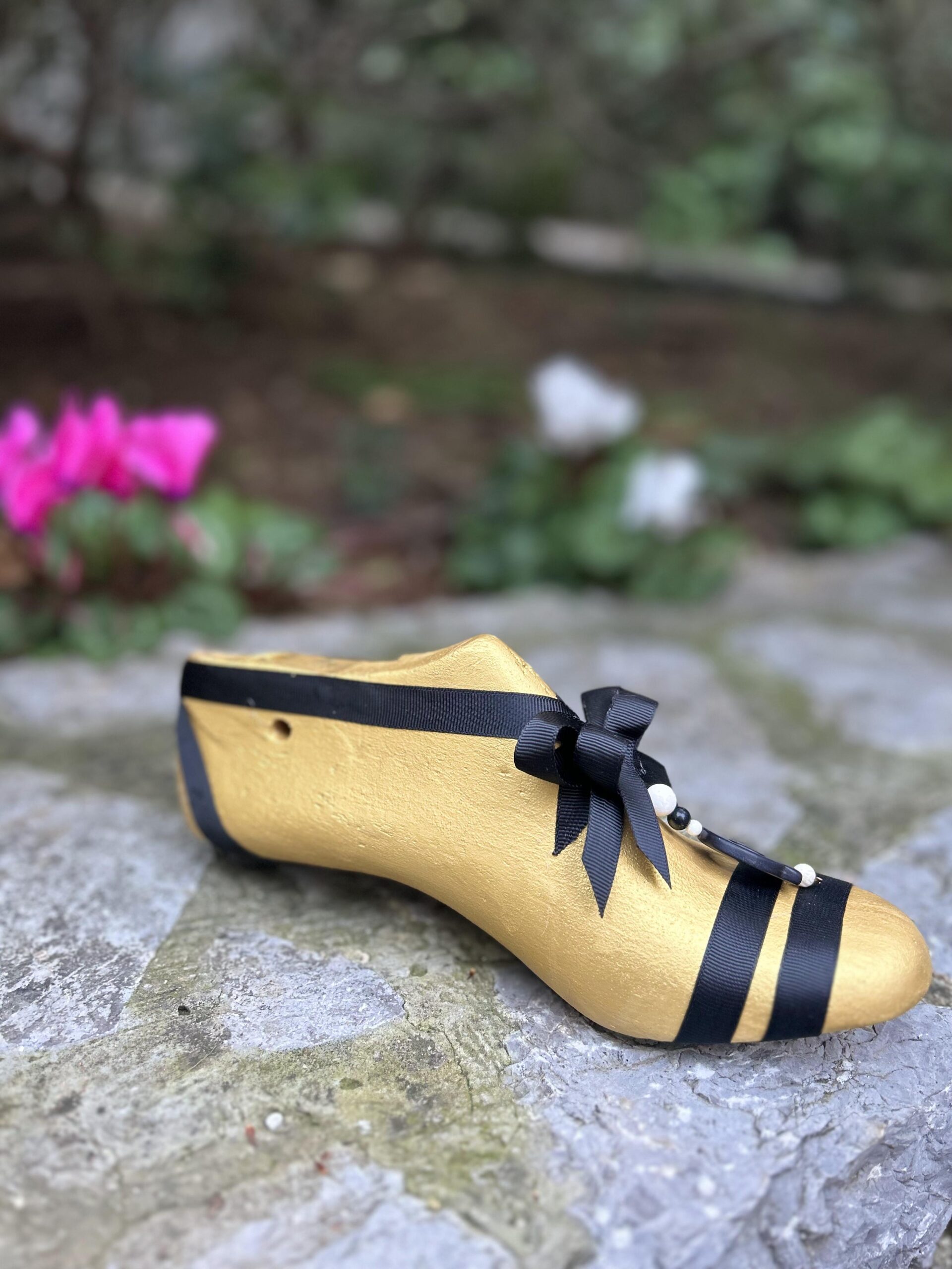 Διακοσμητικά ξύλινα καλαπόδια ‘Golden and Black Perl’ , βαμμένα με ακρυλικό χρυσό χρώμα , γκοφρέ μαύρη κορδέλα – φιόγκο και μαύρες μεγάλες πέτρες .Για αυτό και κανένα δεν είναι ίδιο.