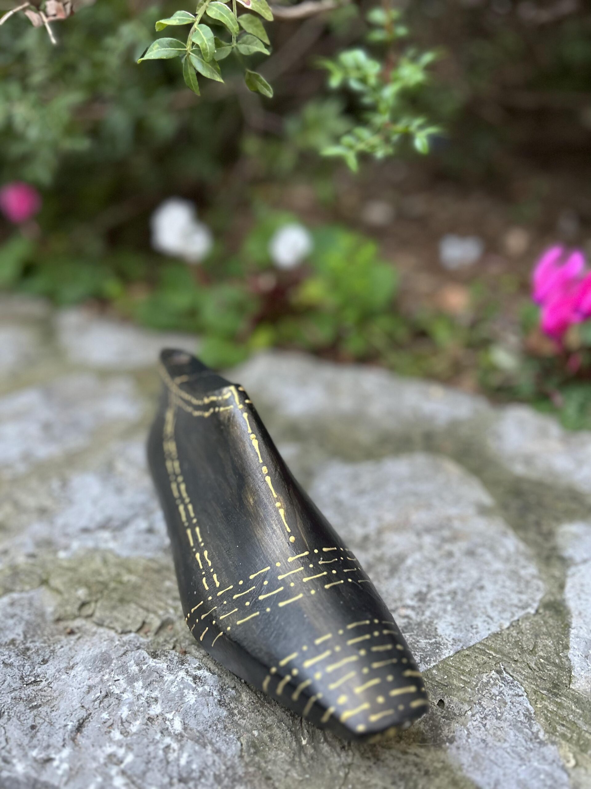 Διακοσμητικά ξύλινα καλαπόδια ,με μαύρο χρώμα , μπρονζέ – χρυσές σκιές και άνισα γαζιά .