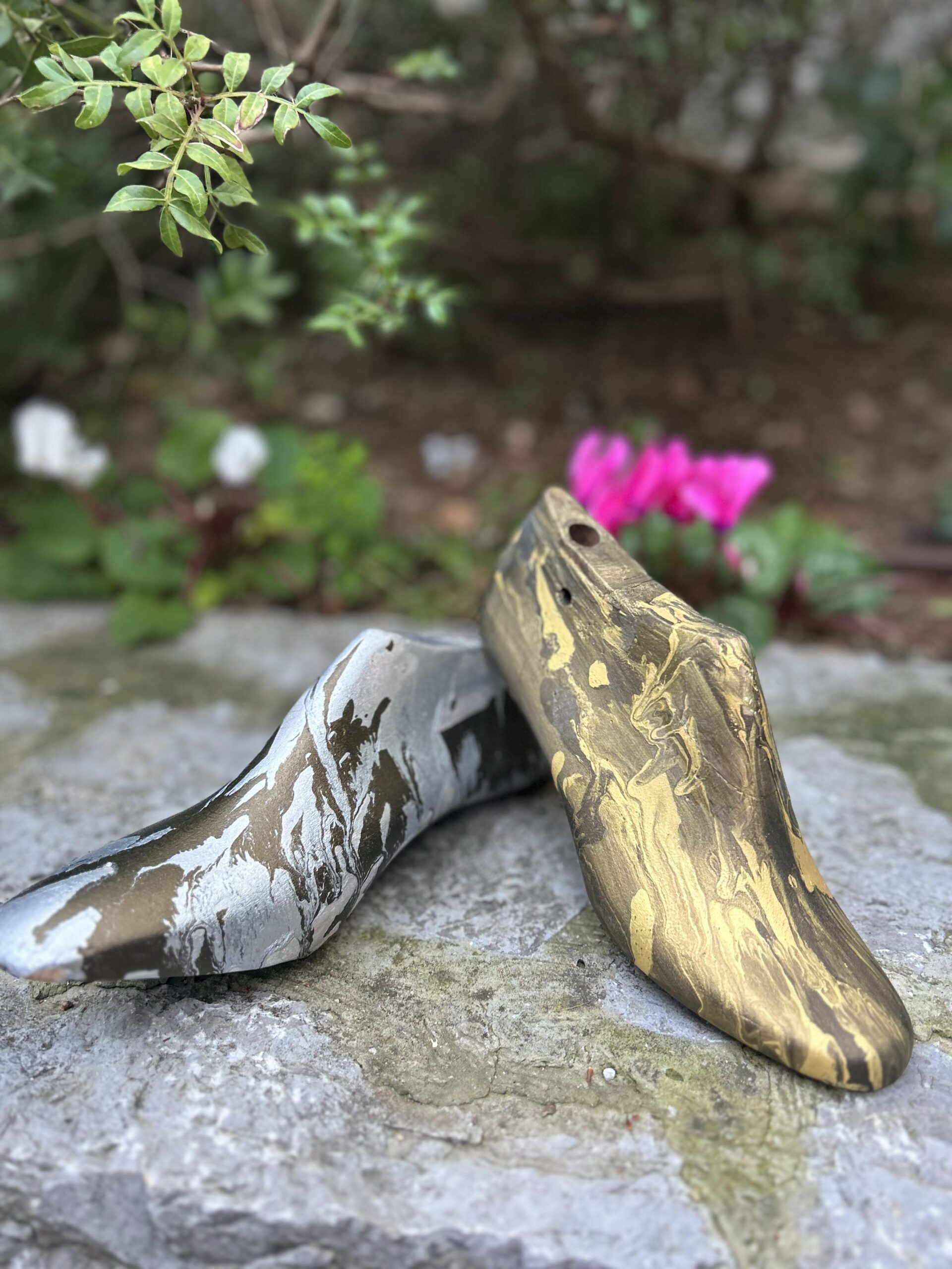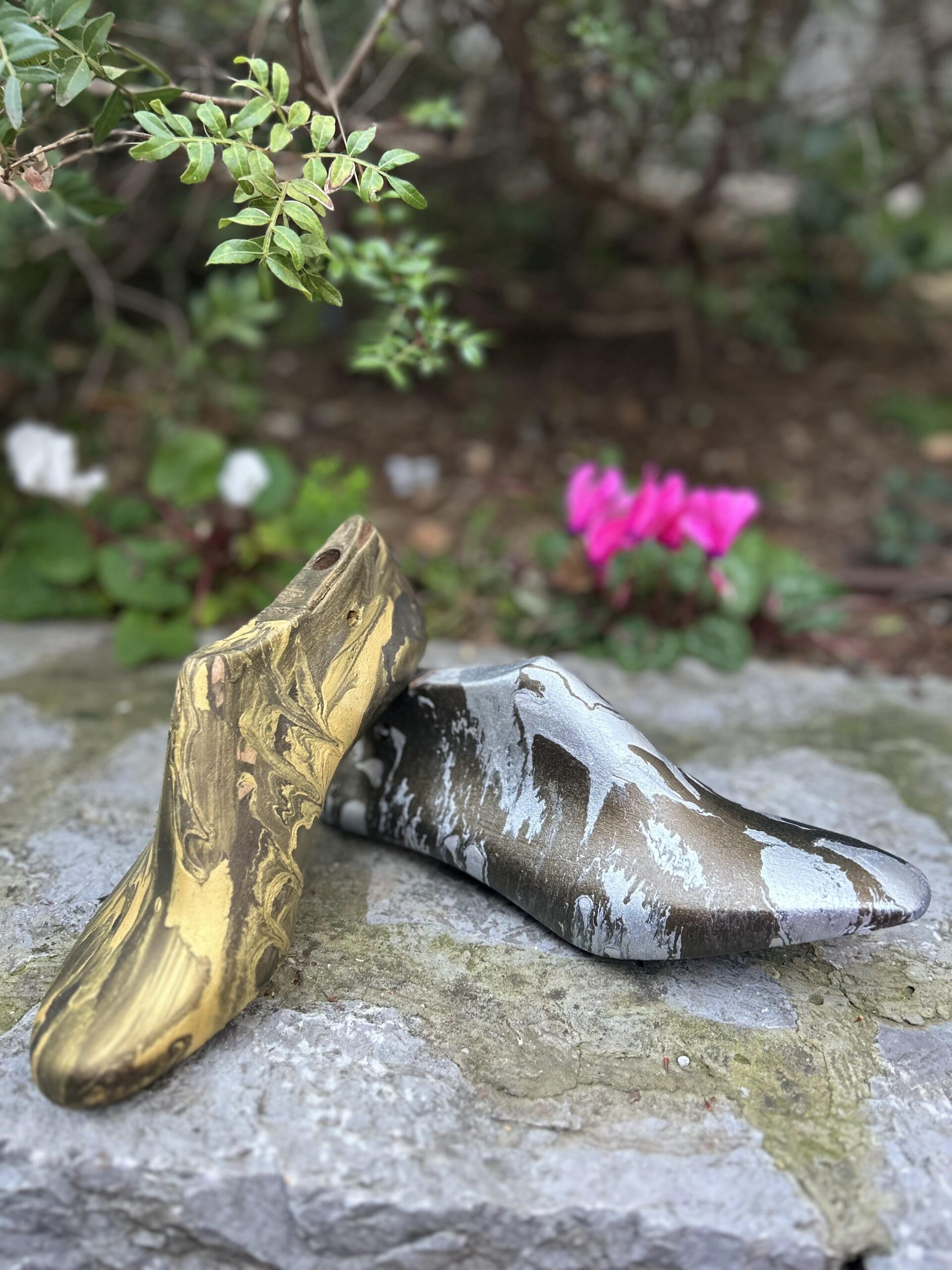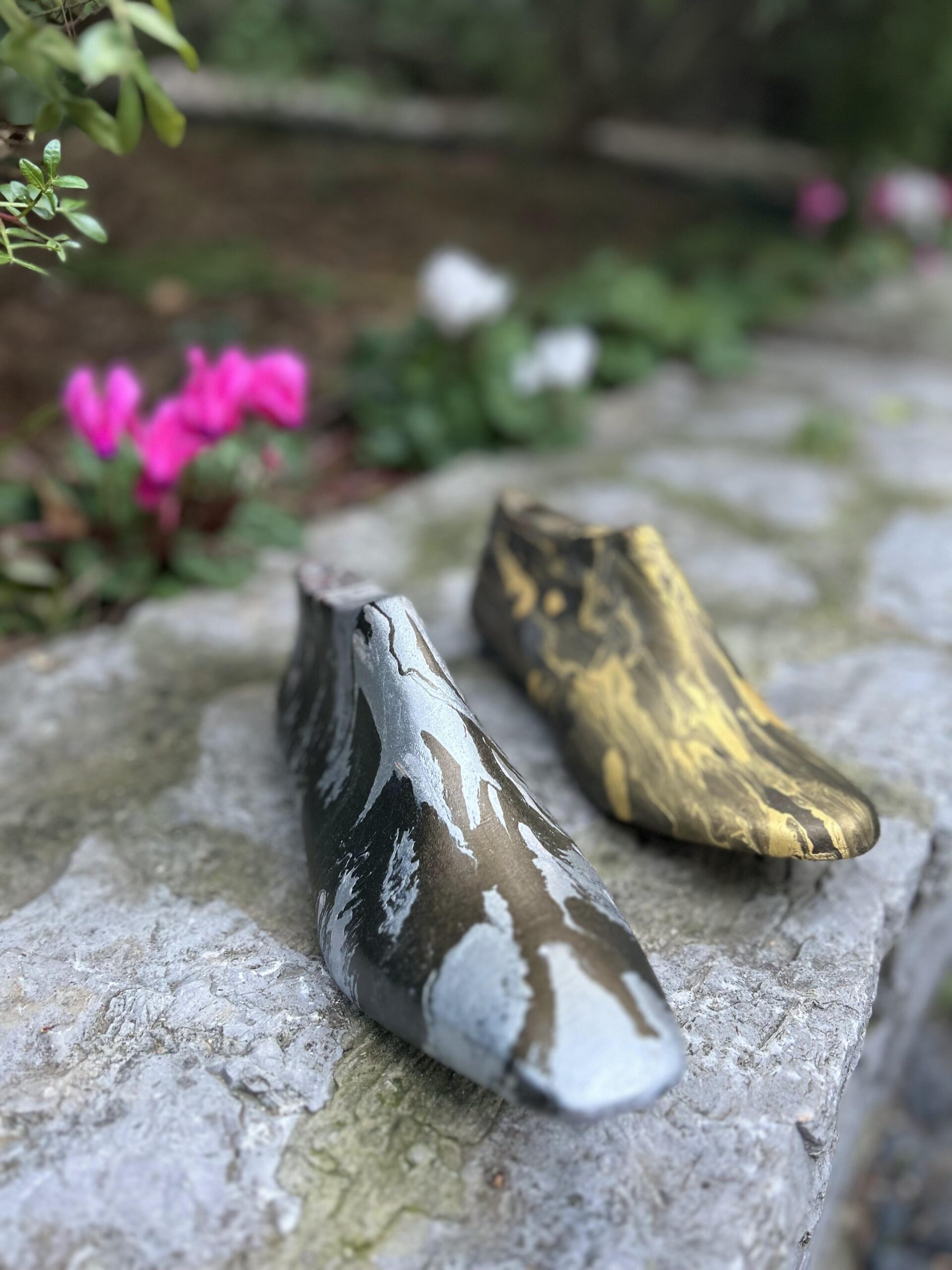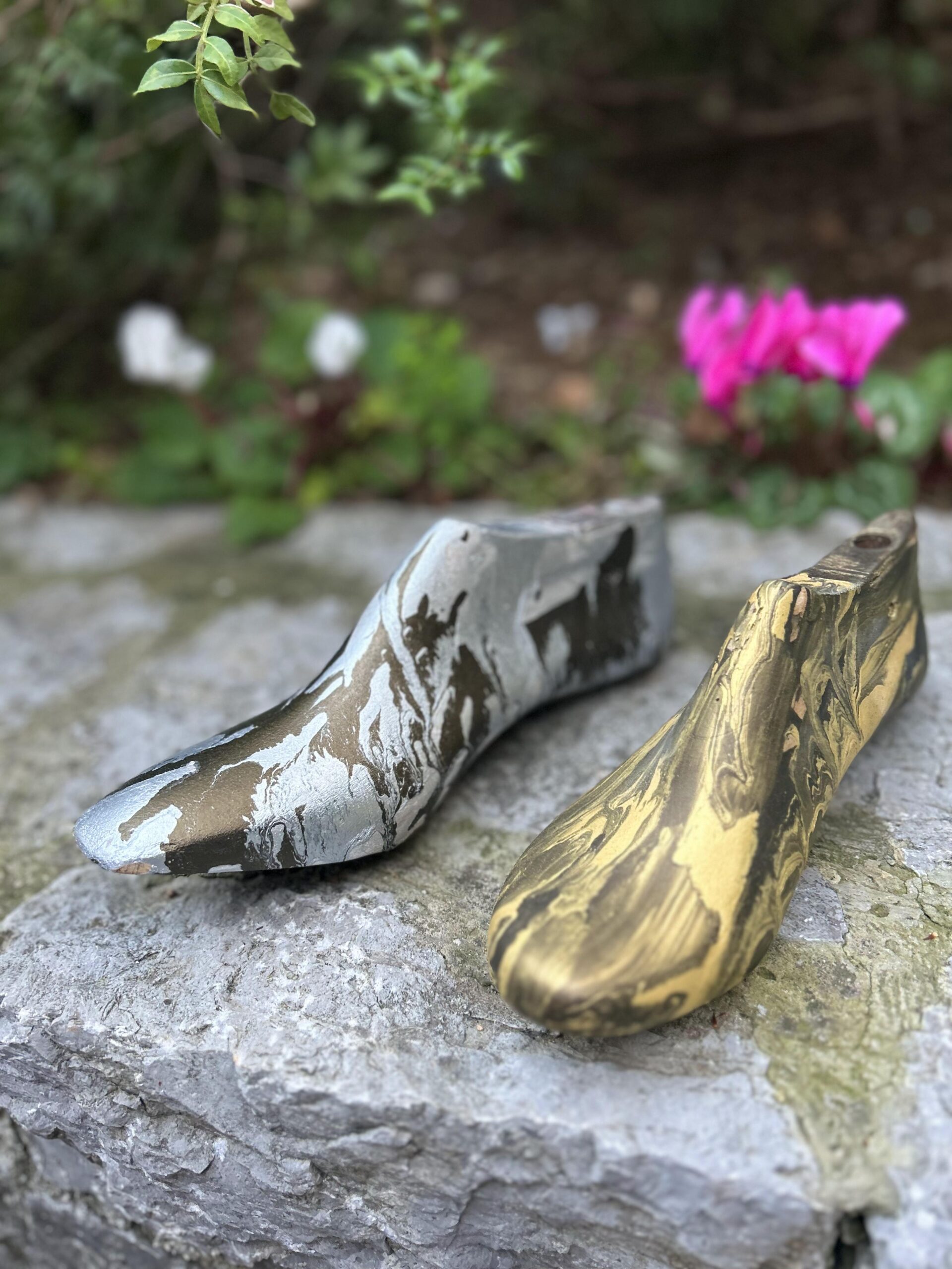 Διακοσμητικά ξύλινα καλαπόδια ‘Ροές’ , βαμμένα με ακρυλικό χρώμα μπρονζέ χρυσό , ασημένιο μαύρο. Τα χρώματα μοιάζουν να έχουν λιώσει πάνω στο καλαπόδι ,γι’ αυτό και κανένα δεν είναι ίδιο.