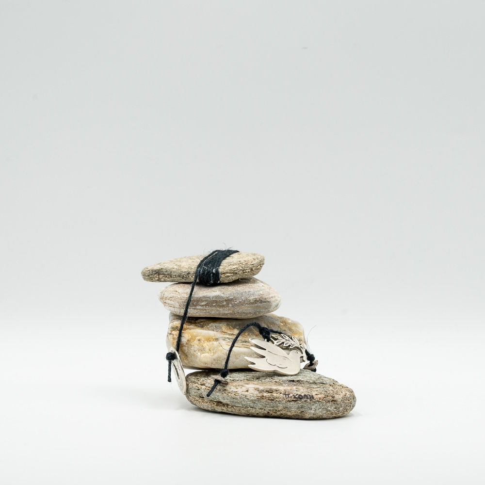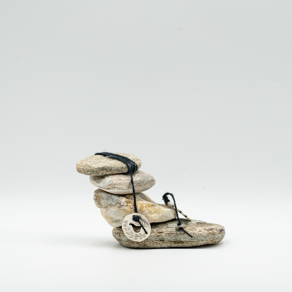 Διακοσμητική πέτρα – Freedom , δεμένη με κέρινο σπάγκο μαζεμένες και ασημένιο φλουρί . Μαζεμένες από παραλία της Άνδρου.